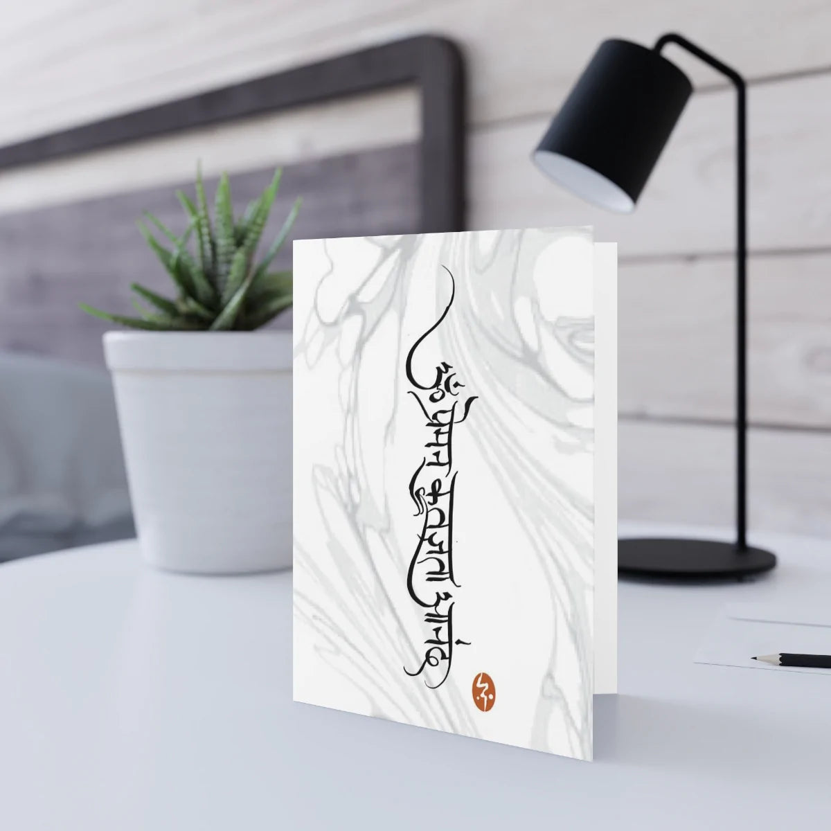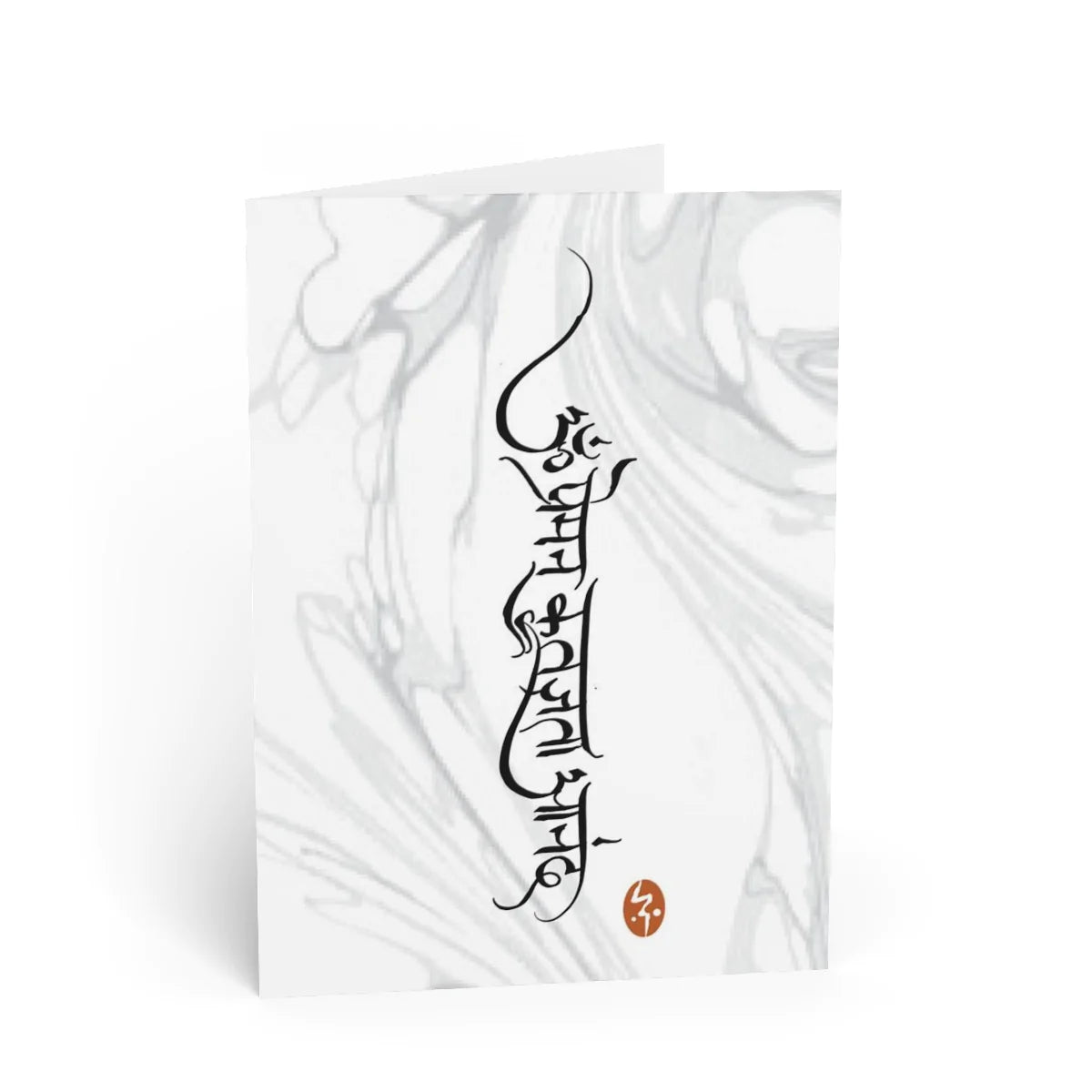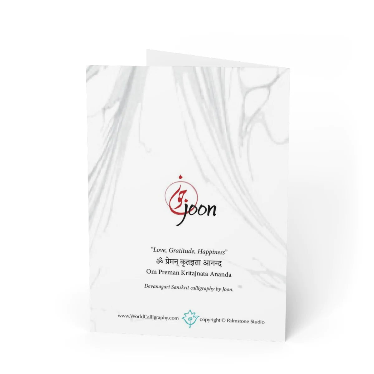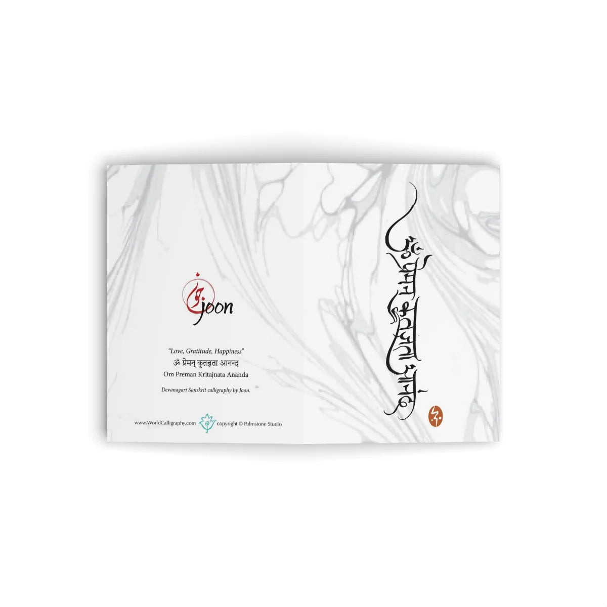This card features a vertical orientation of the Sanskrit words for “Love, Gratitude, Happiness” on a marbled background. Original Devanagari calligraphy design by Joon.