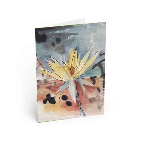 Yellow water lilies cover the wetlands in Florida at certain times of year. They have the same basic shape as the lotus blossom and they, too, rise up out of the mud and the muck and are surrounded by broad leaves. Original ink and watercolour painting by Joon.